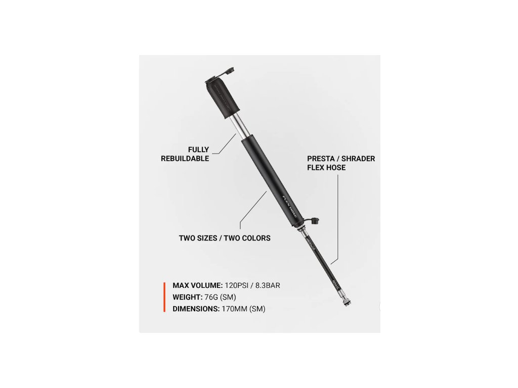 Sport Drive HP je kompaktní pumpa s překrývající se rukojetí určená pro vysokotlaké pneumatiky. Obsahuje obrobenou hliníkovou hlaveň a píst, stejně jako rukojeť Composite Matrix a koncovky. Čerpadlo je vybaveno naší ohebnou hadicí kompatibilní s Presta/Schrader.
